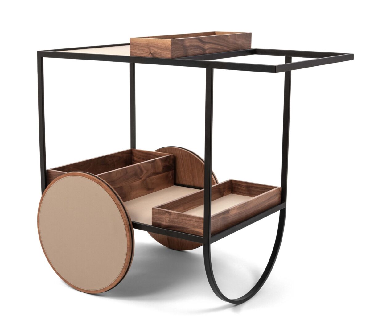 קווים הרמוניים המחברים את פרופיל המתכת החזק עם עץ אגוז, רצפות עור ועם שלוש קופסאות נשלפות.