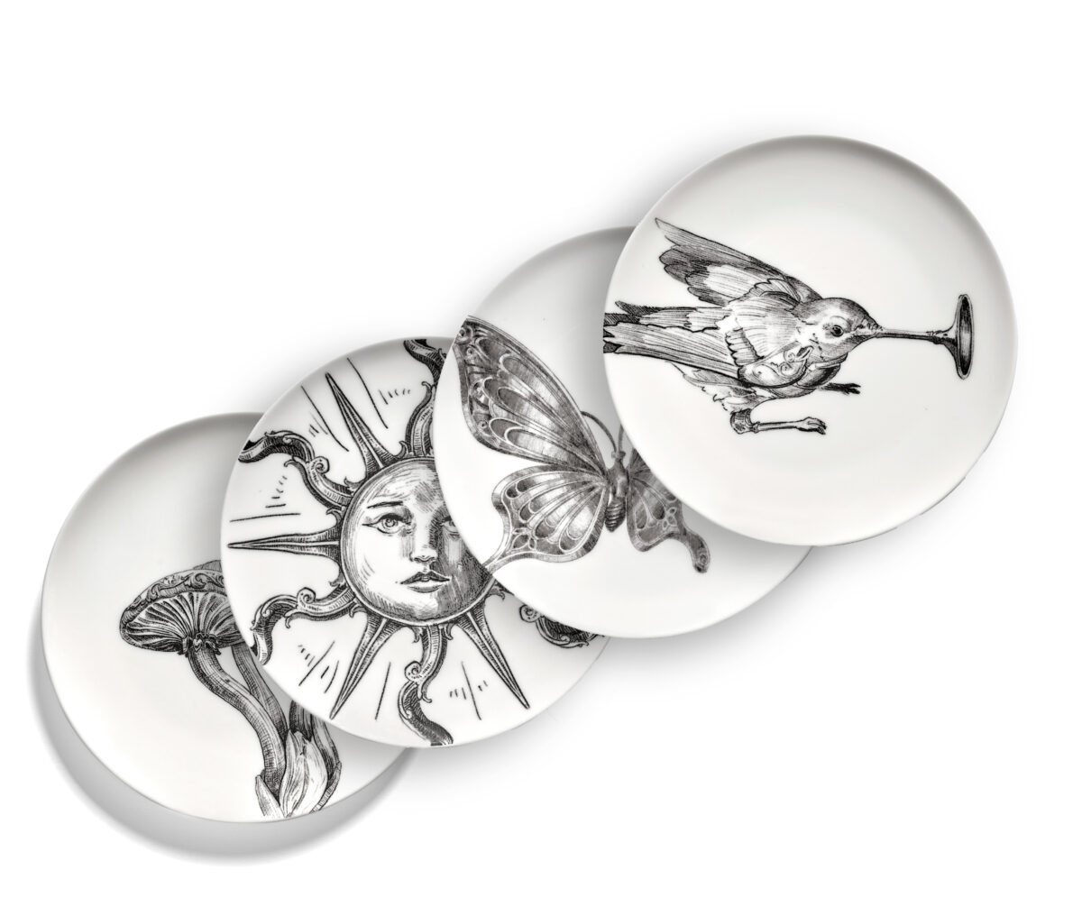 סט זה של ארבע צלחות קטנות מפורצלן מאוסף Unity כולל ארבעה מוטיבים שונים: לצפצף הציפור, פרפר, שמש ופטריות.