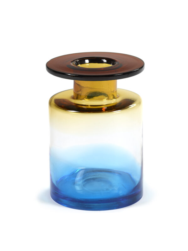 אוסף "רוח ואש" של מארי מישלסן כולל את האגרטל מזכוכית הזה בצבעים של כחול וכתום-ענבר